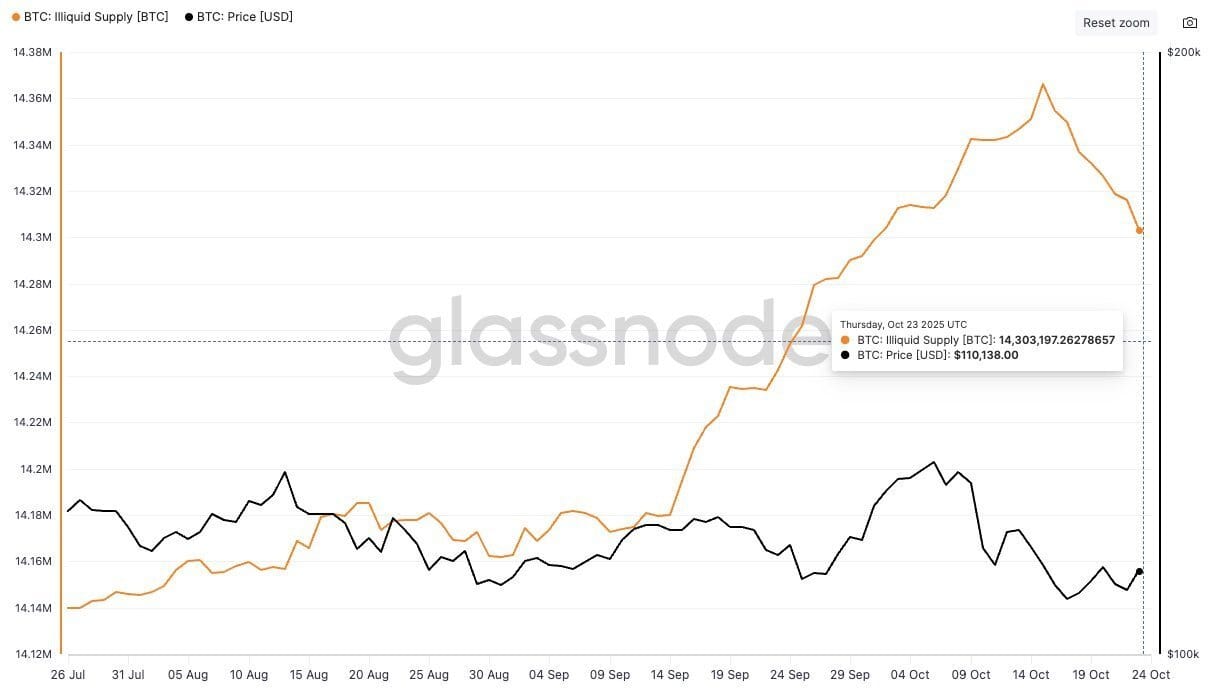 Glassnode added that this is the biggest decline in months, bringing bitcoin’s illiquid supply down to around 14.303 million BTC as of late October.