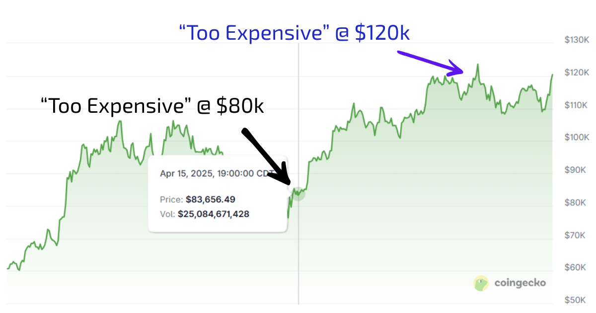 But what actually happened? Many of those who thought Bitcoin was "too expensive" at $80k missed out waiting for a dip that never came. Bitcoin ran to $120k, then pulled back to $100k. Those same people thought it was STILL "too expensive" at $100k because they were anchored to their initial $80k reference point.