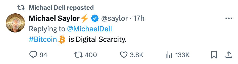 What began with a tweet from Dell inquiring about scarcity continued with a repost of Saylor’s response about Bitcoin being digital scarcity.