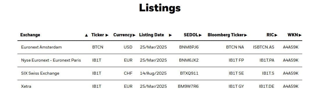 The iShares Bitcoin ETP has now started trading on SIX Swiss Exchange, following its initial debut on Euronext Amsterdam, Euronext Paris, and Xetra in March 2025.