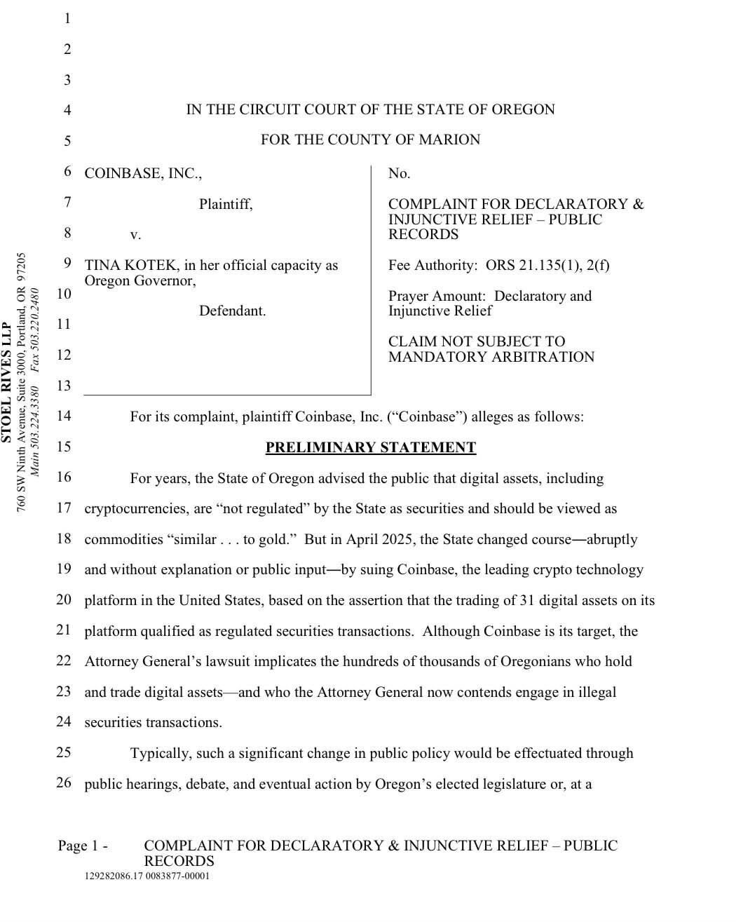 Coinbase says Oregon’s lawsuit undercuts this progress.