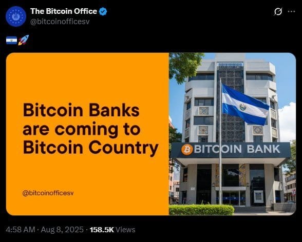 On August 8, the official Bitcoin Office posted on X: “Bitcoin Banks are coming to Bitcoin Country.”