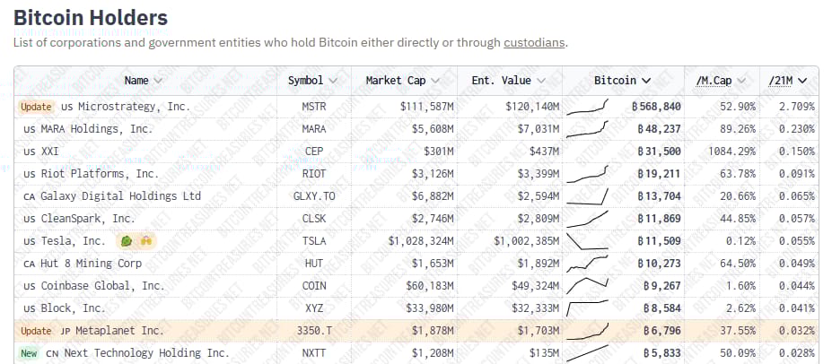 Metaplanet is now the 11th largest corporate holder of bitcoin — BitcoinTreasuries