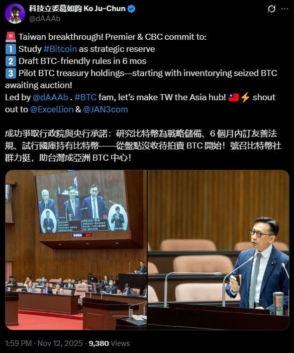 Taiwan is weighing a pilot bitcoin reserve using seized BTC.