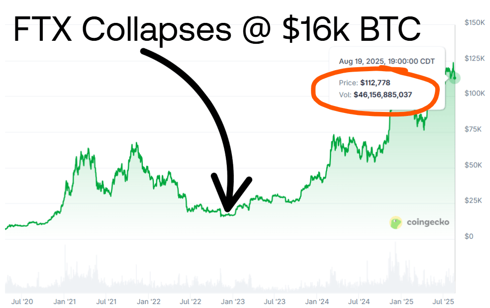 Remember November 2022? FTX collapsed, Bitcoin hit $16K. Everyone focused on "contagion" and sold the bottom. Those who remembered that FTX was just one shitty exchange ended up buying the generational bottom and now are up 7x since.