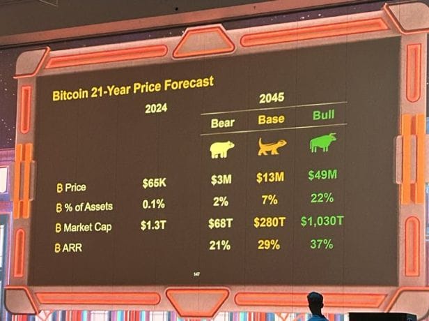 During his Bitcoin Conference keynote, Michael Saylor exemplified this strategy, presenting some eye-popping projections for Bitcoin’s potential performance by 2045.